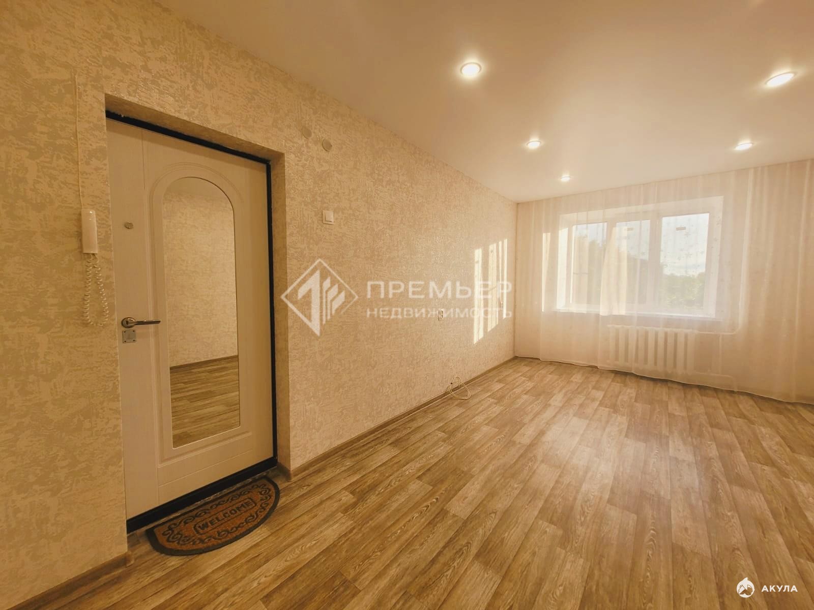 Сама комната большая: 18 кв.м. со свежим ремонтом: на полу новый качественный линолеум, выровнены стены и оклеены новыми обоями, новый натяжной потолок со встроенными точечными светильниками, окно тоже новое: пластиковый стеклопакет, и новая прочная металлическая входная дверь со встроенным большим зеркалом.