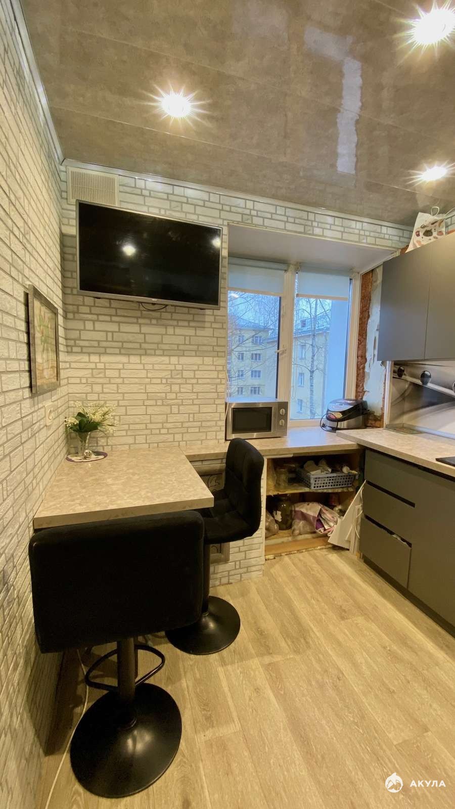 По всей квартире установлены пластиковые окна. Во всех комнатах натяжные потолки. Потолки на кухне и в санузле обшиты пластиком.