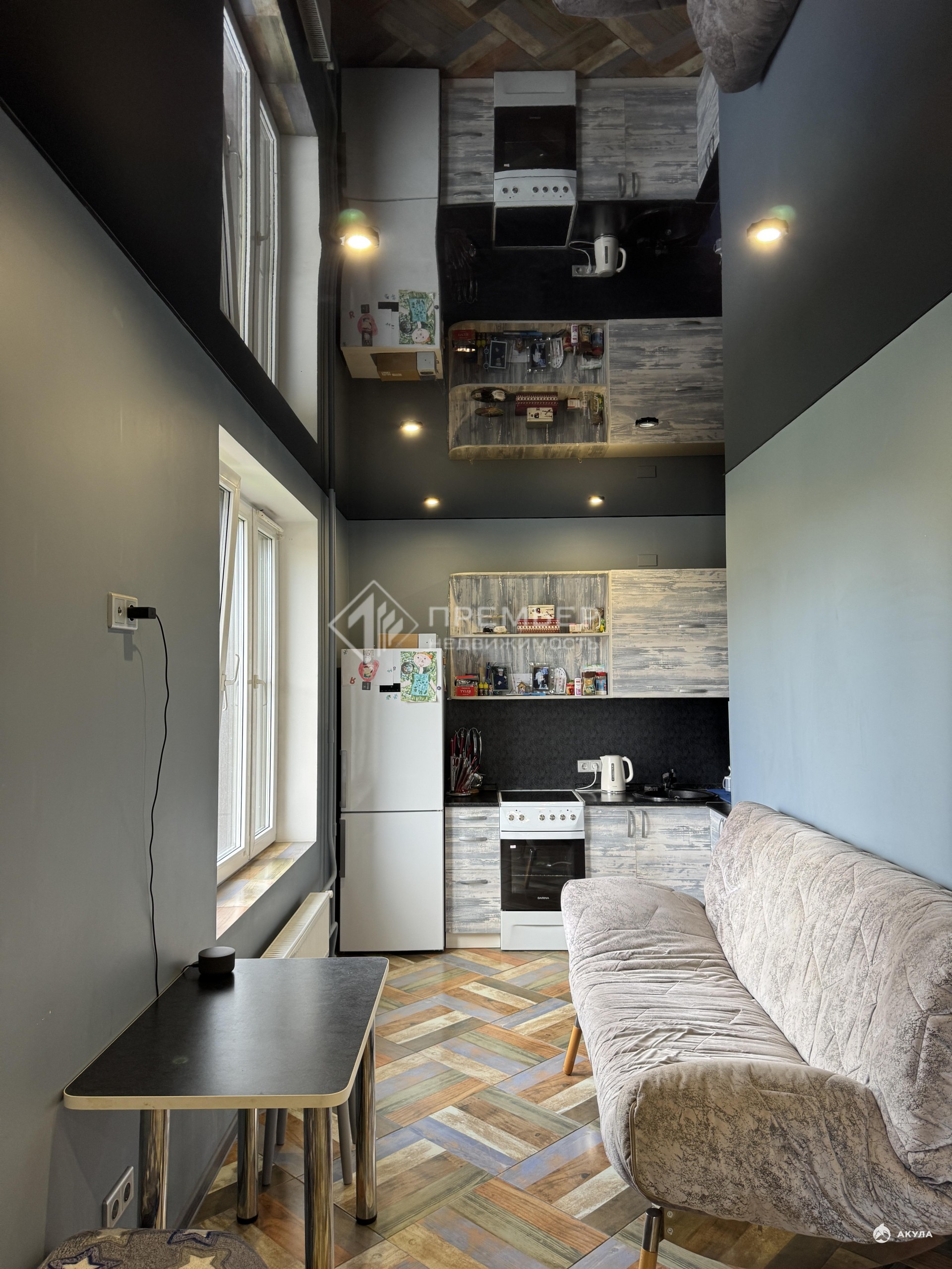 -удобная и уникальная планировка — легко зонируется под спальню и кухонную зону;