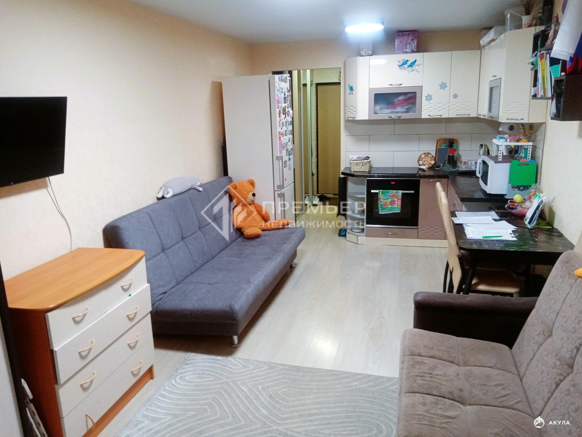 Останется: кухонный гарнитур с варочной поверхностью, шкаф-прихожая, шкаф в комнате и комод.
